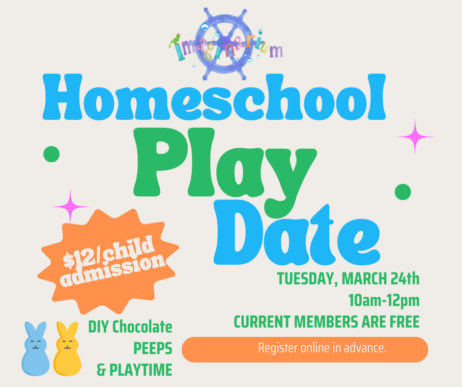 Homeschool Families, come hang out with a playdate just for you!! Join us on TUESDAY, MARCH 24th, 10am-12pm for a Homeschool ONLY DIY Chocolate Peeps & playtime! Current MEMBERS-FREE; Non-Members $12/child!
